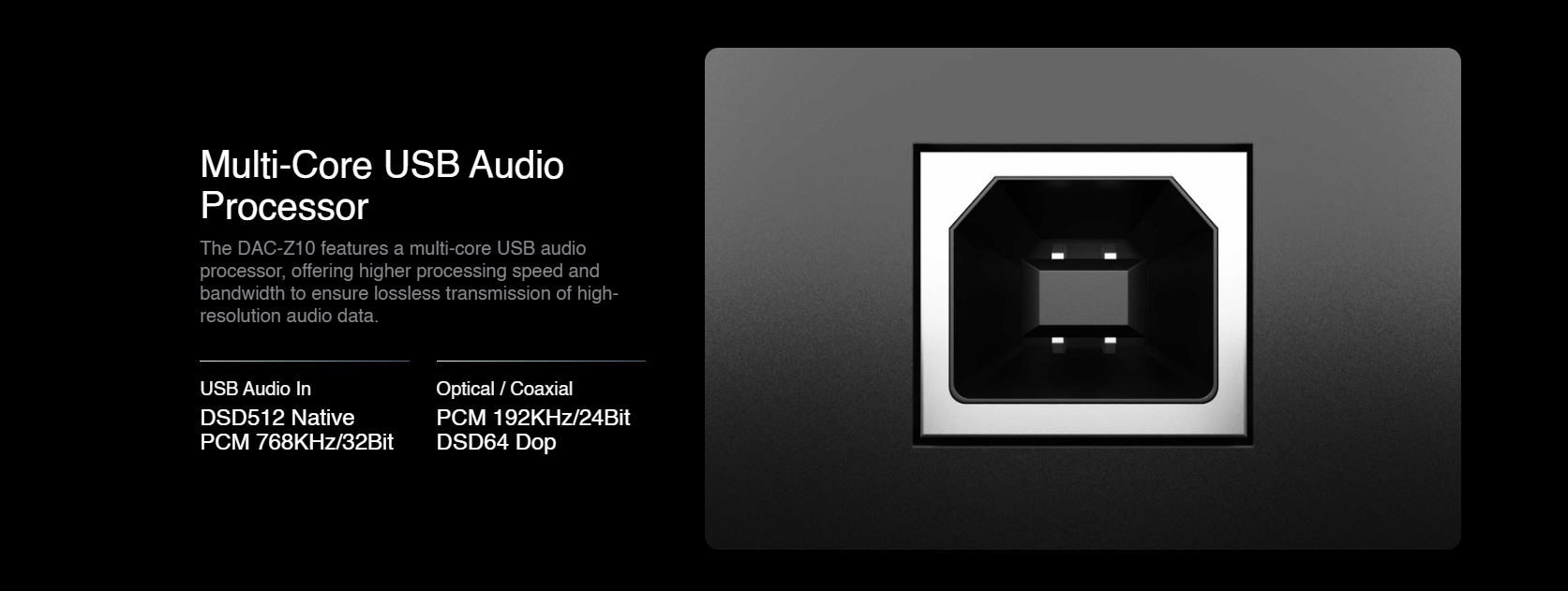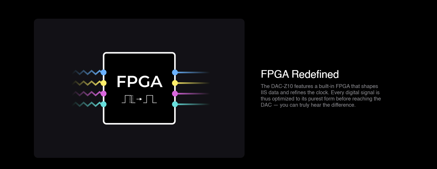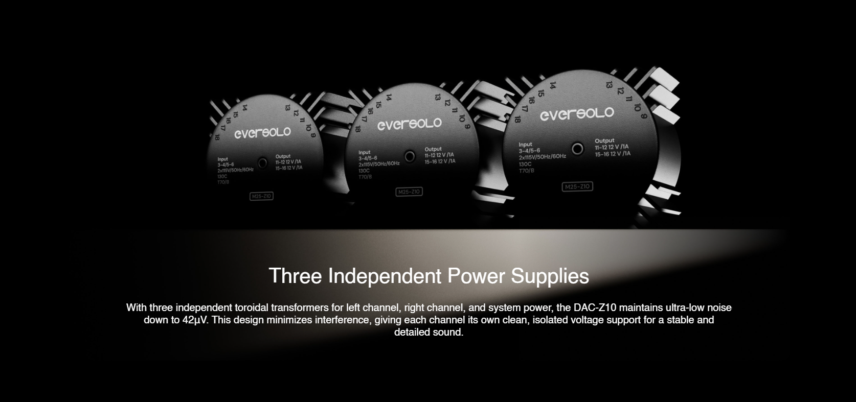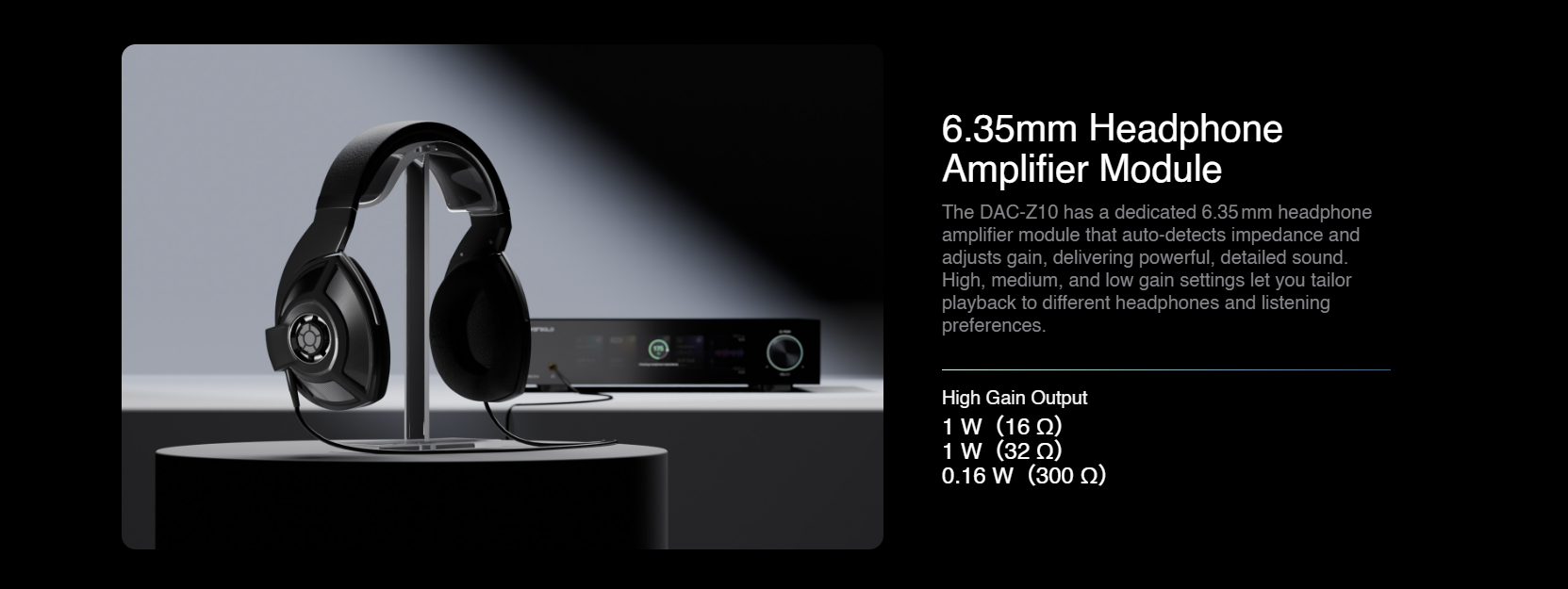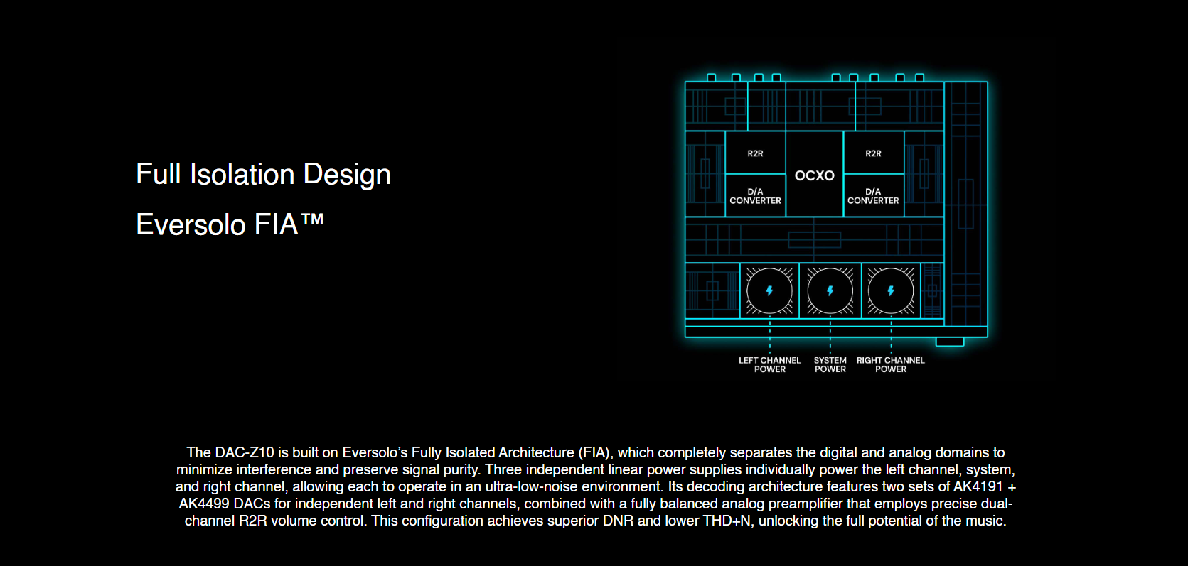DAC-Z10 採用 Fully Isolated Architecture(FIA),將數碼與類比完全隔離,降低干擾,三組獨立環形變壓器供電,左/右聲道及系統電路分別供電,噪聲低至 42 μV。DAC 部分使用 AK4191 + AK4499 配合 Velvet Sound 技術,兼顧精準與溫暖音色。