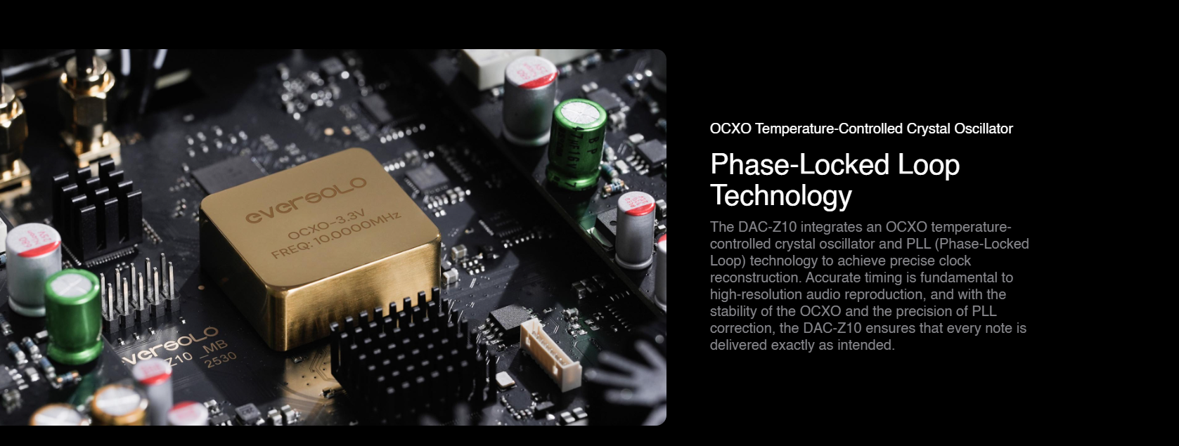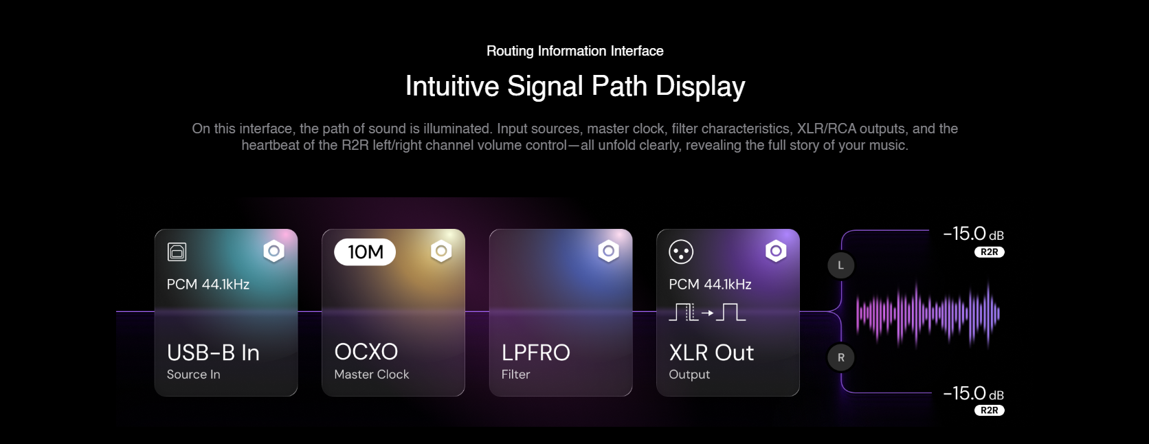 音量控制採真正雙 R2R 電阻梯陣列,保留相位精準與全解析度。前級支援 XLR / RCA 輸入輸出,提供 +10 dB 增益,可作完整數位前端使用,毋須另裝前級。時鐘核心為 OCXO 恆溫晶振,配合 PLL 抑制抖動及 FPGA 時鐘重建,提供飛秒級精準。支援外接 10 MHz / 25 MHz 主時鐘,50 Ω / 75 Ω 阻抗選擇,方便高階系統整合。